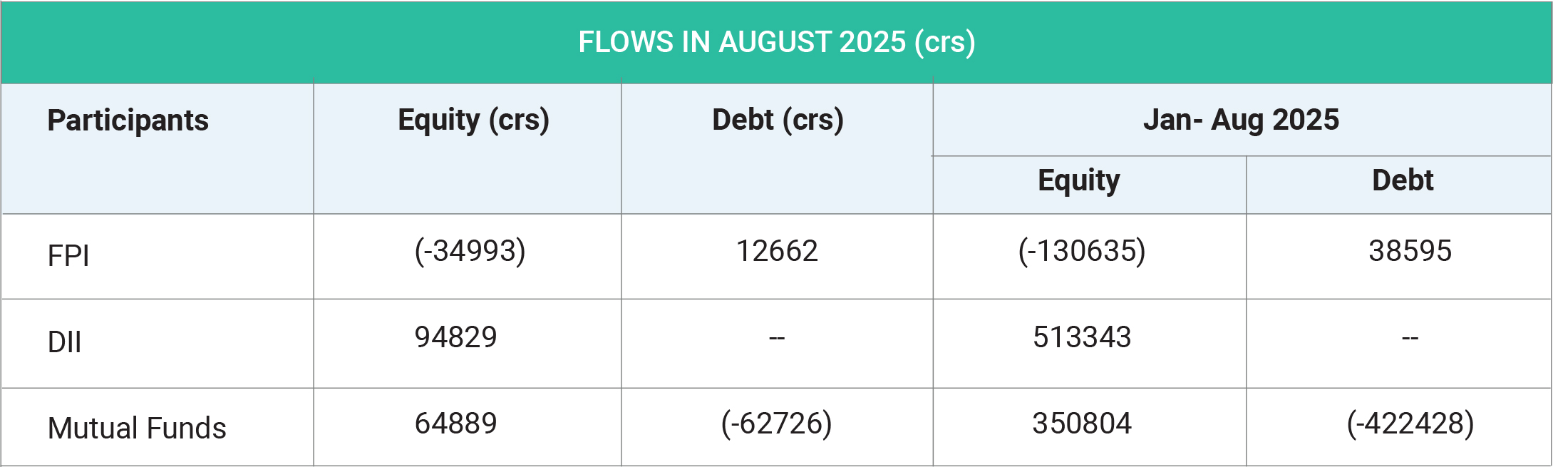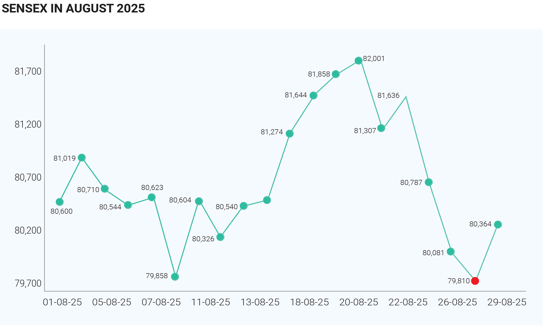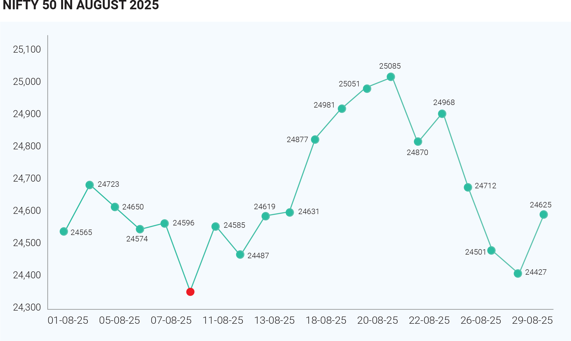 26, reflecting fragile sentiment and investor risk aversion amid mounting concerns over global trade tensions and currency depreciation, reacting sharply to any adverse headlines. The primary catalyst for this heightened volatility was the escalation of trade tensions between India and the United States, as tariff threats hung heavily over market sentiment throughout the month, culminating in Washington’s decision on August 27 to impose a steep 50% tariff on Indian goods, doubling the earlier 25% rate set in July, in response to India’s purchase of discounted Russian oil. This move directly targeted critical export sectors such as gems and jewellery, textiles, footwear, and industrial chemicals, sparking fears that Indian exports to the US could contract by as much as 43%, triggering sharp selloffs across related sectors and accelerating foreign institutional investor (FII) exits. As a result, FIIs remained persistent net sellers throughout the month, withdrawing an estimated ₹47,000 crore from Indian equities, citing not only tariff fears but also the backdrop of a strengthening US dollar, elevated global bond yields, and lingering uncertainty over US economic policy. Export-oriented industries like IT, pharmaceuticals, and specialty chemicals bore the brunt of this selling, dragging down valuations and leading to broader corrections across the benchmark indices. These sustained FII outflows also placed downward pressure on the rupee, which slid close to an all-time low of ₹87.66 per dollar on August 4, adding another layer of vulnerability to sectors dependent on imports and further denting market confidence. Yet, despite this pronounced external weakness, the Indian market avoided a steeper correction thanks to the robust counterbalancing role played by domestic institutional investors (DIIs), who acted as shock absorbers during turbulent phases. DIIs, including mutual funds, LIC, and insurance companies, injected a massive ₹95,000 crore into equities during the month, nearly double the amount withdrawn by FIIs, and this strong domestic buying, focused particularly on fundamentally sound sectors like banking, infrastructure, and consumer goods, helped cushion the indices against deeper falls. These capital flow dynamics, sectoral performances were uneven, with auto and FMCG sectors delivering robust gains driven by healthy domestic sales and resilient consumption demand, while pharma, financials, and defence counters came under pressure due to global headwinds and tariff uncertainties. The market was influenced by phases of profit-booking, as investors locked in early-August gains from heavyweight stocks, occasionally pushing indices into negative territory, though recoveries were often aided by positive domestic policy moves. One of the most significant domestic policy developments was the Group of Ministers’ approval on August 21 of a major simplification in the Goods and Services Tax (GST) structure, which proposed merging most rates into two slabs of 5% and 18% with expected implementation by late September. This reform was interpreted as a potential consumption booster ahead of the festive season, benefiting consumer-focused sectors and fuelling optimism that supported markets during an otherwise challenging month. In contrast, another notable domestic move—the passing of the Promotion and Regulation of Online Gaming Bill, 2025, which imposed a complete ban on real-money online gaming—negatively impacted listed entities in the digital gaming space, showing the divergent effects of sector-specific policy. Macroeconomic indicators also provided resilience: India’s GDP growth was projected at a strong 6.5% for FY25, while the services sector PMI reached a 15-year high of 62.9 in August, signalling robust expansion in domestic services activity. Inflation, meanwhile, remained subdued, with even food inflation turning negative, supporting rural consumption and bolstering the outlook for consumer demand. The Reserve Bank of India maintained its accommodative stance, keeping the repo rate steady at 5.5% while ensuring liquidity and credit flow, with the benign inflation backdrop giving policymakers room to support growth without stoking inflationary pressures. Export performance too remained encouraging in certain areas, as shipments rose nearly 6% year-on-year in Q1 FY26, aided by government initiatives like the Foreign Trade Policy 2023 and the Make in India program, which particularly boosted electronics competitiveness. On the global front, in addition to tariff escalations, other developments also weighed on Indian equities: persistently high global interest rates in the US and EU constrained liquidity and kept capital flows under pressure, while muted global growth forecasts from the IMF and World Bank underscored weakening demand in key export markets such as the US, EU, UK, and Germany, particularly hurting India’s IT, textile, and pharmaceutical sectors. At the same time, the Jackson Hole Economic Symposium provided a temporary boost to sentiment when the US Federal Reserve Chair hinted at the possibility of rate cuts in the near future, offering hope of eventual liquidity easing. Nevertheless, the net effect of global events remained heavily skewed toward caution, as evidenced by FII outflows exceeding ₹35,000 crore during the month, largely in response to trade tariffs, weak global demand, and rupee depreciation. Overall, August 2025 was a month of contrasts for Indian markets: on one side, heavy foreign selling, tariff shocks, rupee weakness, and global uncertainty drove sharp volatility and tested investor nerves, while on the other, strong domestic inflows, policy reforms like GST simplification, resilient macroeconomic data, and sectoral bright spots in autos, FMCG, and banking prevented steep corrections and kept benchmarks range-bound. The broader implication was that the Indian market demonstrated increasing resilience against global shocks, as do